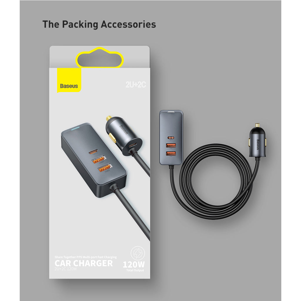 Baseus 120W Car Charger Quick Charger QC 3.0 PD 3.0 Type-C USB Portable Phone Charger with 1.5m Extension Cord