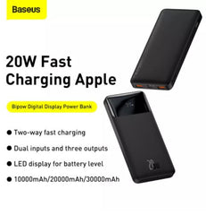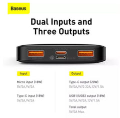 Capacity available : 10000mAh / 20000mAh PD 20W iP fast charge, type-c ports supports 9V/2,22A output LED Display shows battery percentage in real time Multi-device charging, dual input and three outputs Small size portable and handy Support Huawei/Samsung fast charging protocols High quality polymer lithium battery ensures safe power storage and discharge NTC temperature protection Small current distribution, automatically adjust outputs to the required current according to devices Sweat proof and anti-fingerprint texture makes it comfortable to hold
