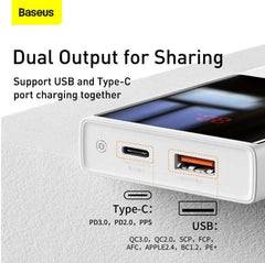 Product Specification ⚡Support Multiple Fast Charge Protocols: Support SCP, PD, QC and AFC fast charge protocols, reducing charge time. ♥ LED digital display screen for showing remaining capacity power ♥ With 1 USB output, 1 Type-C port, easy to charge 2 devices at the same time ♥ Mini and compact, convenient to carry, ideal for traveling usage ♥ Support SCP, PD, QC and AFC Fast Charge ♥ Brand: Baseus ♥ Core: Polymer lithium battery ♥ Battery capacity: 10000mAh/20000mAh ♥ Input: 5V 3A / 9V 2A ♥ Type-C Output: 5V 3A / 9V 2.22A / 12V 1.5A ♥ USB Output: 5V 5A / 5V 4.5A / 5V 3A / 9V 2A / 12V / 1.5A ♥ Product size: 10000mAh/105*54*17mm; 20000mAh/122*54*29mm ♥ Weight: 10000mAh/180g; 20000mAh/330g