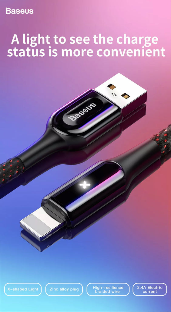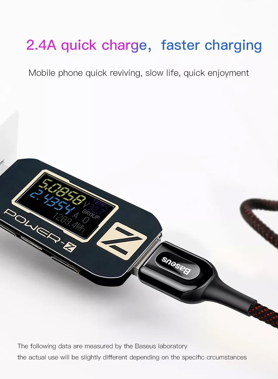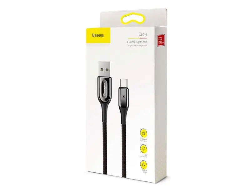 he Baseus X-type Light Cable is suitable for Type-C devices and features an exquisite design along with an indicator light which shows charging status. In addition, provides simultaneous 2.4A fast charging and data transmission