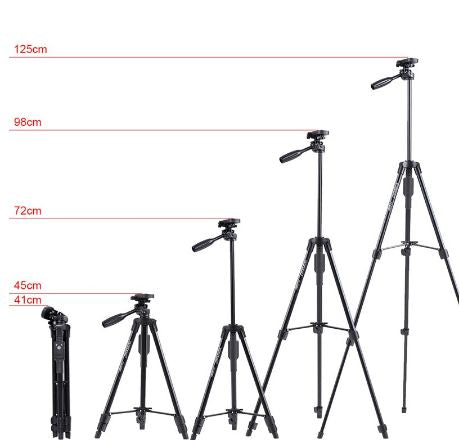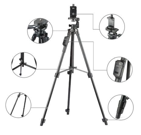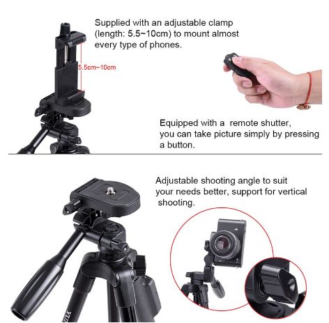 Product Features ● Aluminum alloy tripod stand, lightweight and compact, sturdy and durable. ● Extendable three sections legs with quick release lock. ● Easy to operate, height adjustable between 43cm and 125cm. ● Features with a pan-tilt-swivel 3-way head, grip for adjusting head position. ● Standard 1/4” screw interface compatible with most digital cameras. ● Comes with Phone Clip and Bluetooth Remote Shutter for Smartphones. ● Versatile applications, suitable for office, home, leisure activities and travelling Product Specifications ● Model: YUNTENG VCT-5208RM ● Head: Three-dimensional head ● Moving Head angle: 360 degrees ● Tilt (downward): 90 degrees ● Tilt (up): 65 degrees ● Material: Aluminum Alloy & ABS ● Weight: about 0.6kg ● Maximum load: 2kg ● Number of leg sections: 3 ● Maximum leg diameter: about 18mm ● Fold Length: 43cm ● Tripod Minimum height: 43cm ● Tripod Maximum height: 125cm
